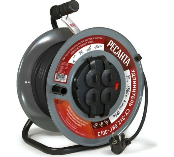 Удлинитель 30м 4роз. КГ 3х2,5 на металл.катушке с заземл.и выкл. Ресанта 61/118/9